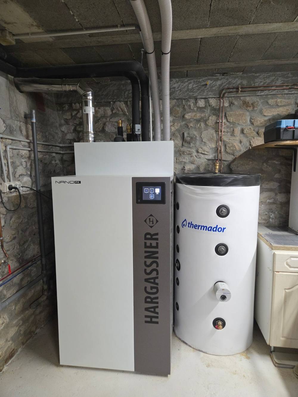 À Larajasse (Rhône) , nous avons remplacé une ancienne chaudière fioul Buderus par une chaudière à granulés de bois HARGASSNER Nano PK de 6KW raccordée sur un silo de plus de 225L