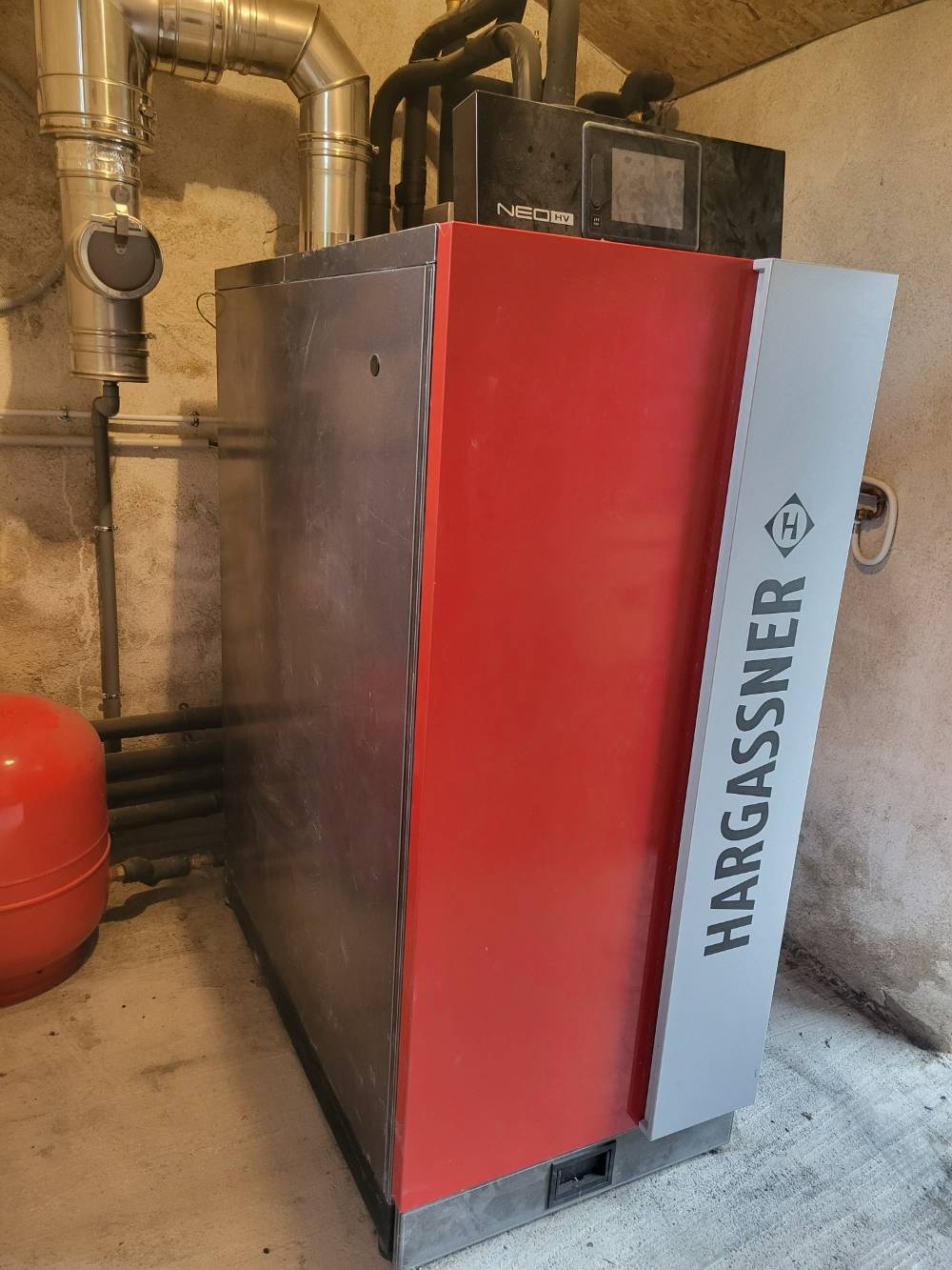 A St Cyr les Vignes près de Feurs dans la Loire (42), nous avons installé une chaudière à bois bûches Hargassner NEO HV 20 kW pour bûches de 50 cm.