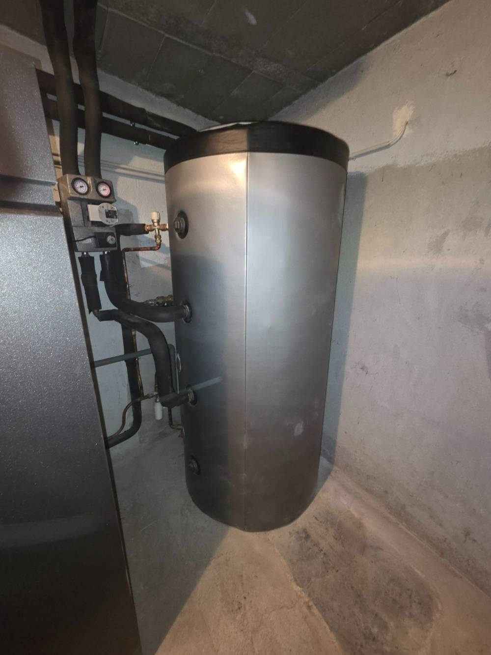 La chaudière assure le chauffage et la production d'au chaude sanitaire. Elle est raccordée à un ballon tampon hygiénique de 478 litres avec échangeur inox pour la production eau chaude sanitaire.