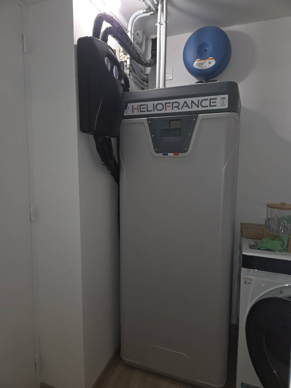 Ce chauffe-eau solaire en matière synthétique permet d'éviter tout risque de corrosion. Nous avons aussi installé une chaudière à bois buches Hargassner qui prend la relève de celui-ci si nécessaire.