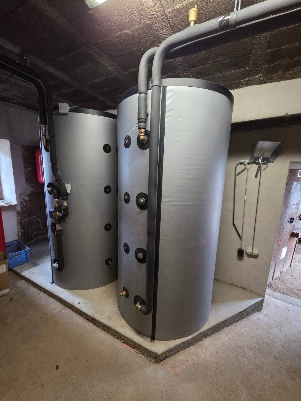 La chaudière est couplée à deux ballons tampon de 887 litres chacun.