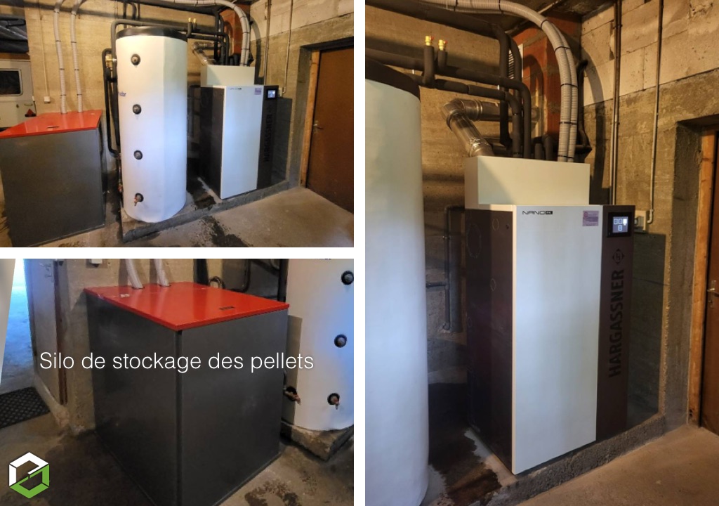 Chaudière fioul HS Starm hors d'usage, remplacement par une chaudière à pellets Nano PK 12 avec mini silo de 500Kg